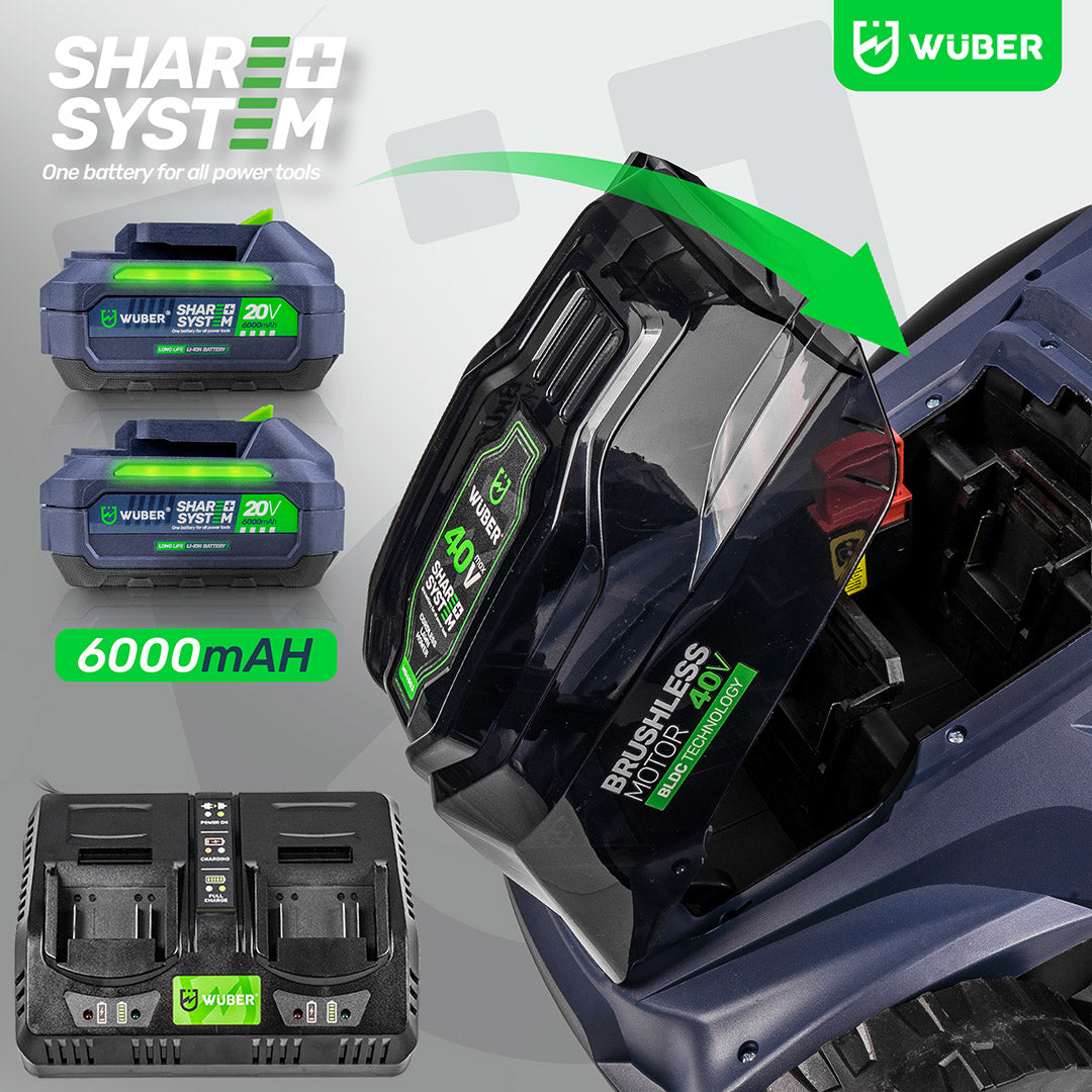 Akumulatory 6,0 Ah umożliwiają do 20 minut pracy na jednym ładowaniu, a technologia Share+ System pozwala używać tych samych baterii w innych narzędziach ogrodowych, eliminując potrzebę dodatkowych zasilaczy.
