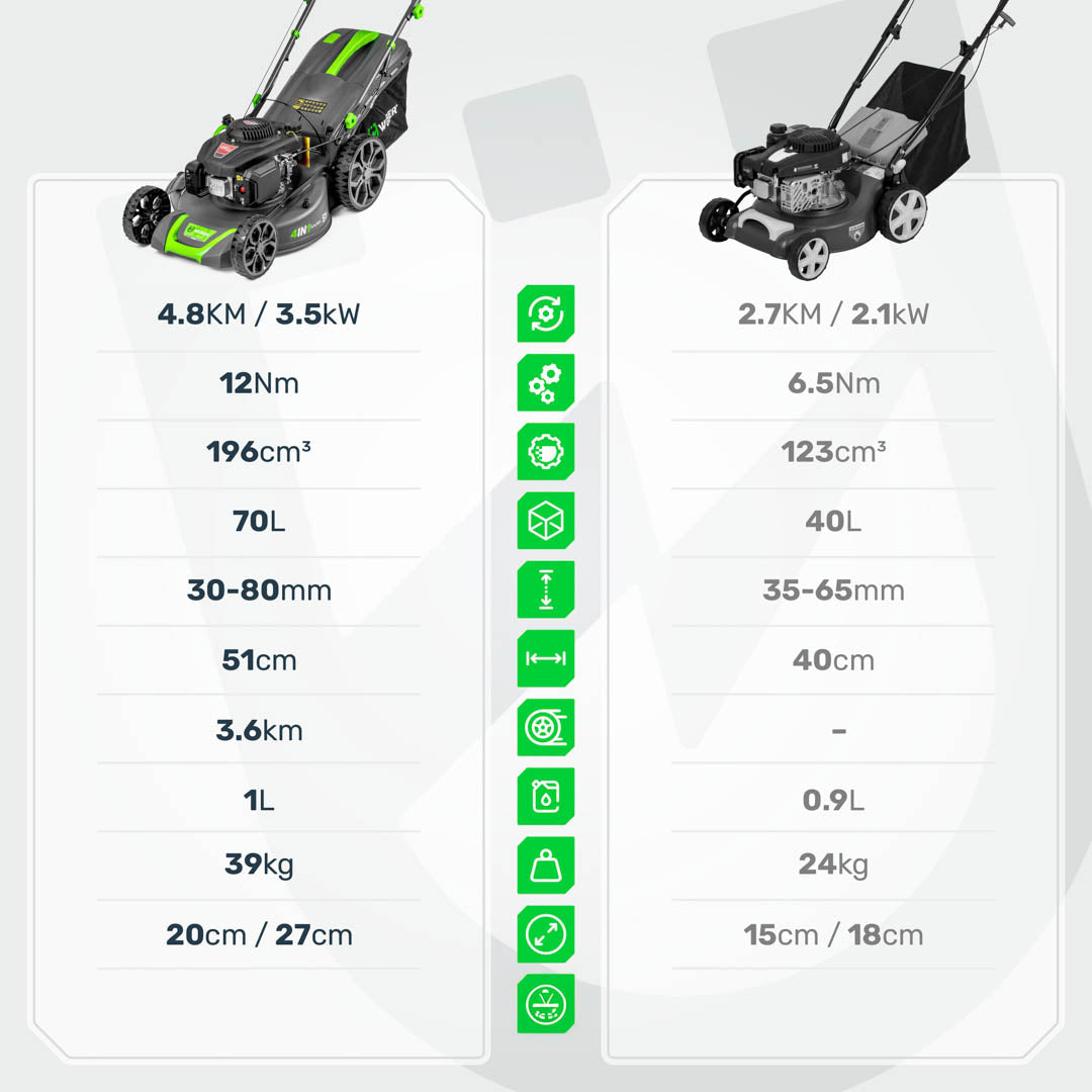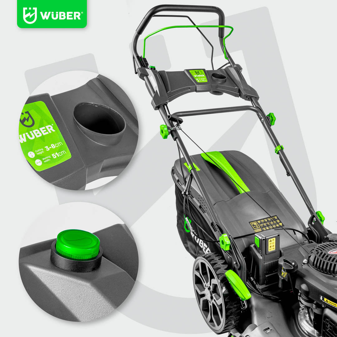 Kosiarka oferuje szerokość koszenia 510 mm, co umożliwia szybkie i efektywne koszenie dużych powierzchni, a 6-stopniowa regulacja wysokości cięcia od 30 do 80 mm pozwala dostosować pracę do różnych warunków i rodzaju trawy.
