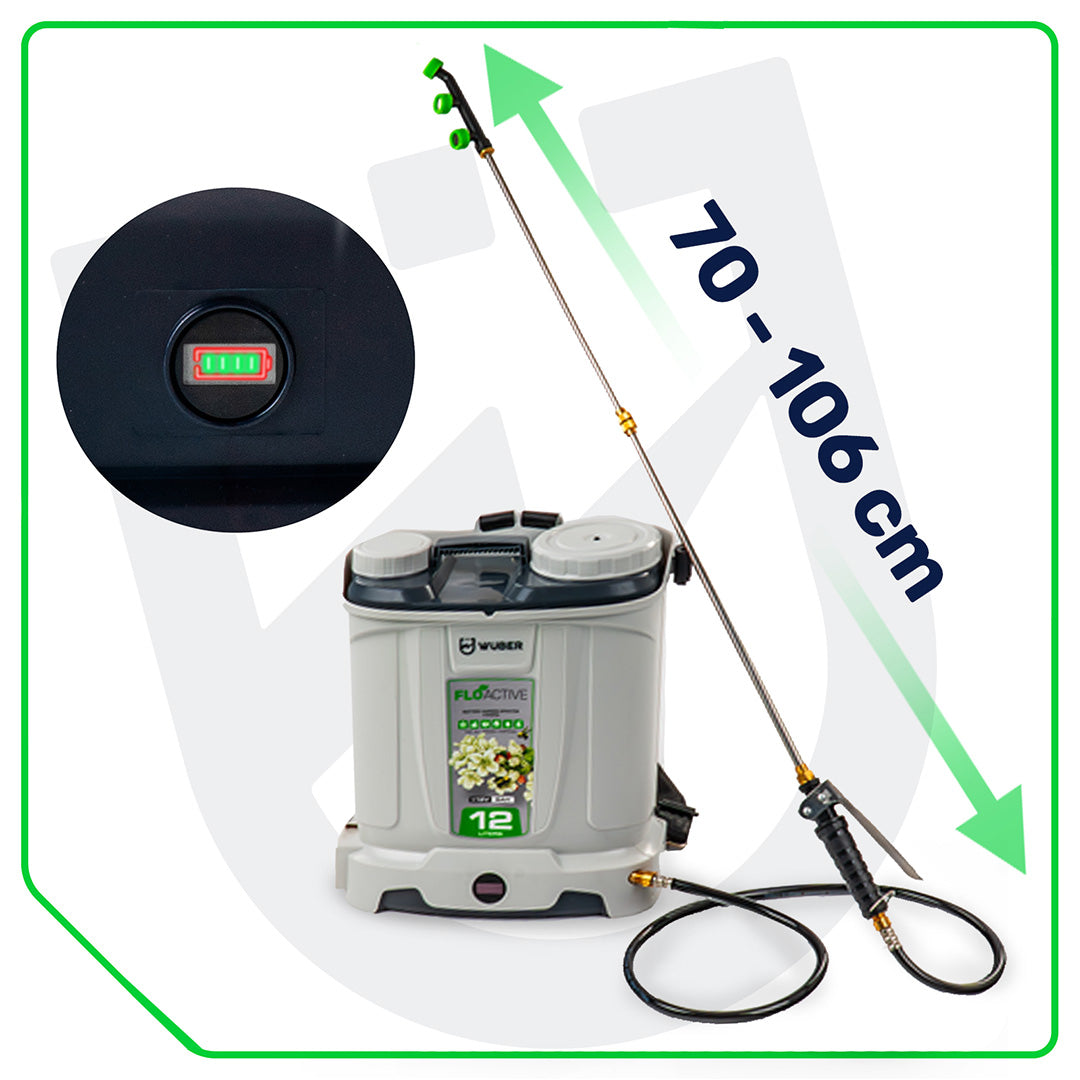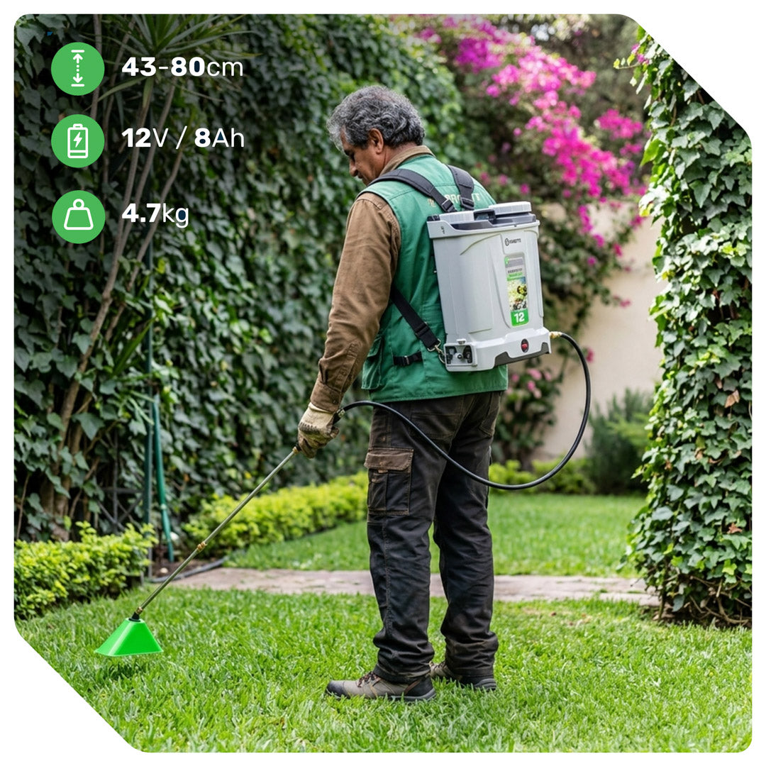 Wydajny akumulator 12 V 8 Ah zapewnia nawet do 4,5 godziny ciągłej pracy, gwarantując niezawodne zasilanie podczas oprysku.