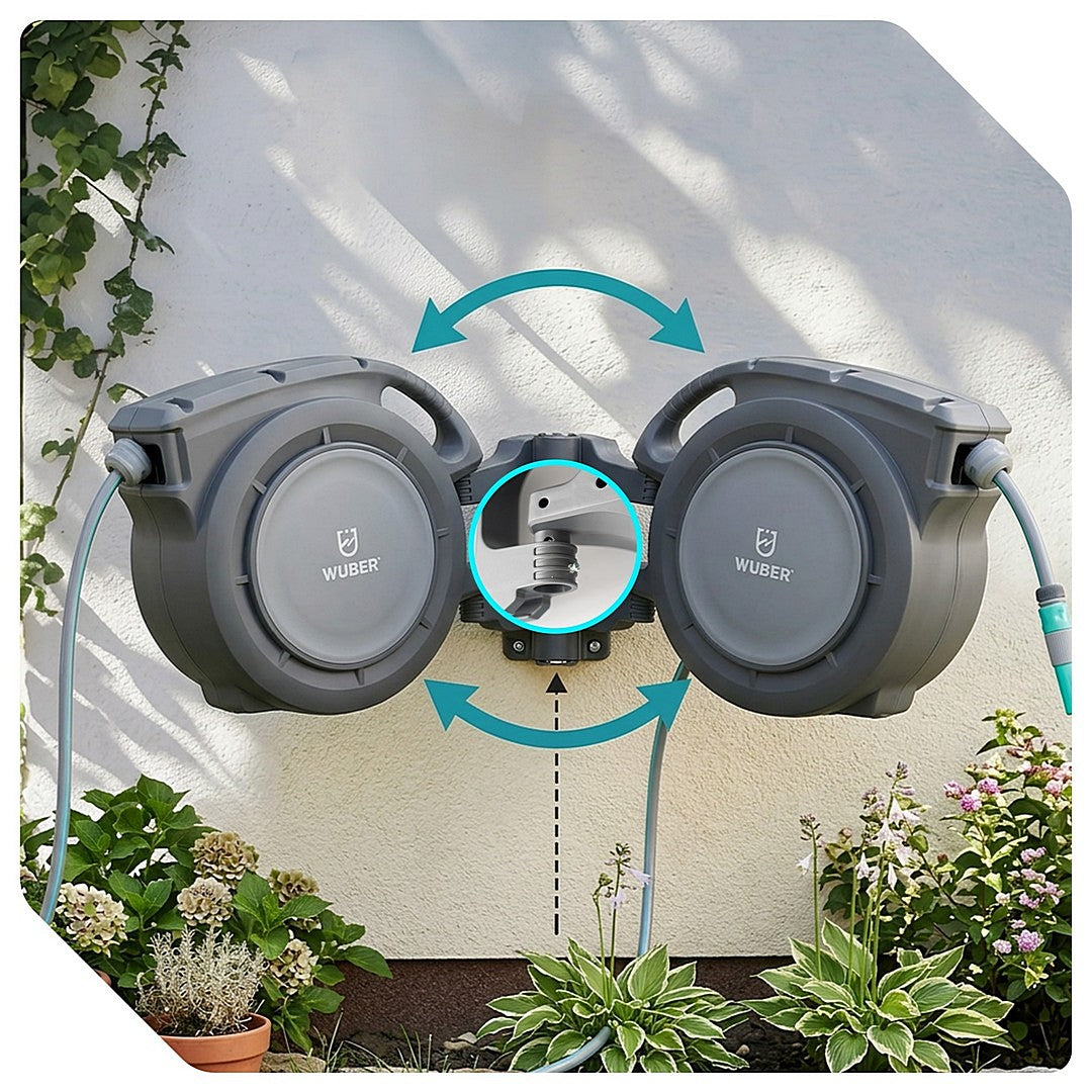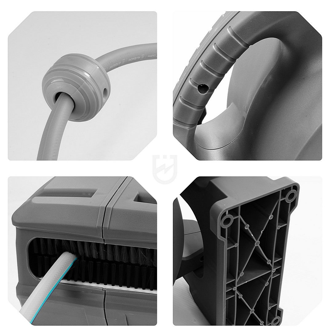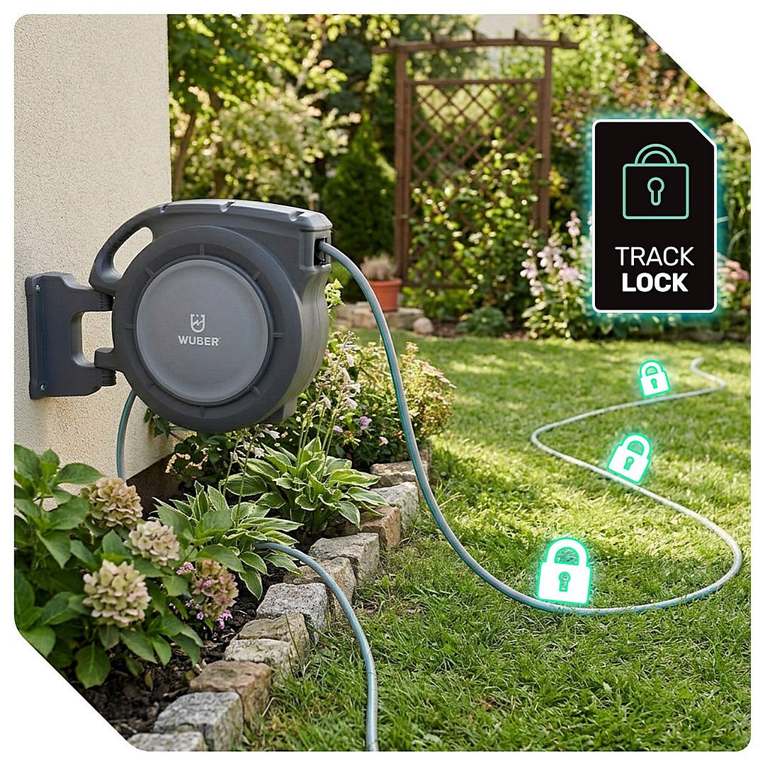 Mechanizm zwijania działa płynnie, ogranicza szarpnięcia i zwiększa bezpieczeństwo użytkowania. Stoper oraz blokada chronią przed gwałtownym cofnięciem węża, a możliwość zatrzymania na dowolnej długości zapewnia wygodę i pełną kontrolę podczas pracy.